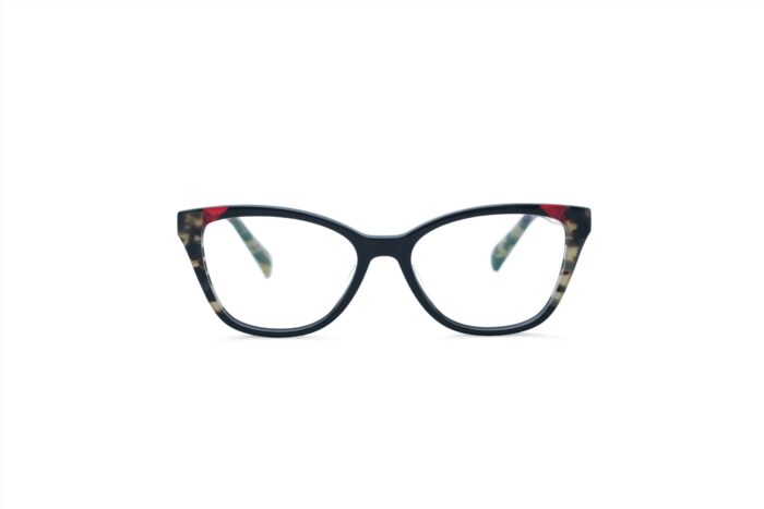 Experience elegance and boldness with the cat-eye acetate frame featuring a mesmerizing floral pattern of green and black along the legs. Accentuated with a striking red detail on the front, this design is the epitome of sophistication and charm.