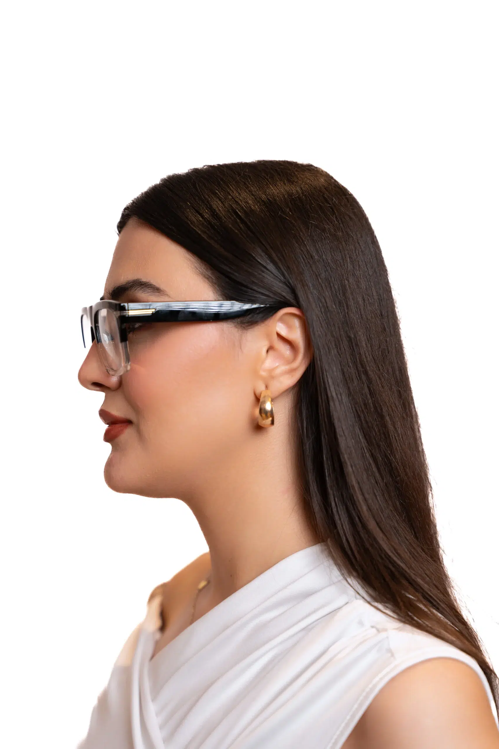 Arms: The thick and ergonomic arms provide a comfortable grip while maintaining the bold design of the frame. The golden accents extend seamlessly to the arms, tying the overall look together.